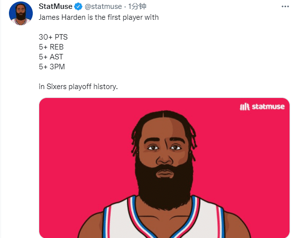 哈登76人生涯首次在季后赛轰下30+,也是他职业生涯第45次在季后赛轰下30+,超越库里,仅次于詹姆斯(118次)和杜兰特(71次)排名现役第三;哈登成为76人队史第一位在季后赛单场拿到30+5+5+5记三分球员;赛后76人官方盛赞,哈登,后撤步之王。