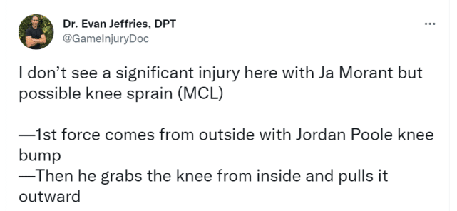 JRS直播05月08日讯 ,勇士142-112大胜灰熊,莫兰特轰下34分7助攻,却在第四节意外受伤,提前离场。慢镜头显示,莫兰特的膝盖先是被普尔撞到,随后普尔在抢球时又抓到莫兰特的膝盖。赛后,灰熊主帅詹金斯炮轰普尔的这一动作,并表示球队会先进行内部讨论,再决定是否申请联盟调查普尔。