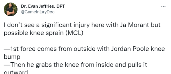 对于莫兰特的伤情,医学专家Evan Jeffries表示:我没有看到莫兰特遭遇严重伤病,可能是膝盖扭伤,第一股外力来自乔丹-普尔膝盖的撞击,然后他抓住莫兰特的膝盖向外拉。