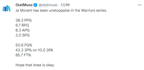 灰熊和勇士系列赛三战打完,莫兰特场均轰下38.3分6.4篮板8.3助攻3抢断,投篮命中率高达50.6%、三分命中率43.3%和罚球命中率85.7%,希望莫兰特的膝盖伤势无大碍;目前灰熊1-2落后,莫兰特真伤不起,任何一名球员都伤不起。