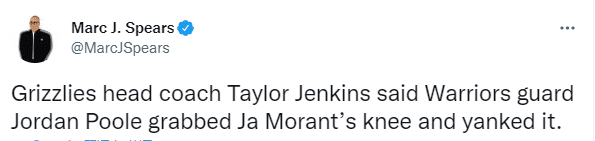 赛后灰熊主帅詹金斯表示普尔使劲拉拽导致莫兰特的膝盖受伤,但詹帅没有更新莫兰特的伤情,他还表示球队将会讨论是否要求联盟调查普尔弄伤莫兰特这件事。
