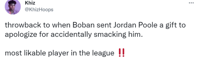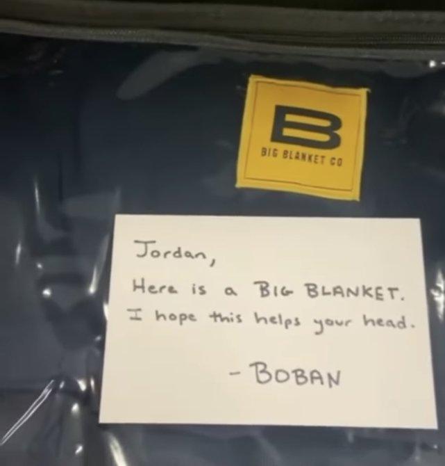 值得一提的是,博班赛后还为普尔送上了一份礼物:一块加大版的毛毯,并配上了一张纸条,上面写着:“乔丹(普尔),这是一块大毛毯,我希望这能对你的头部有帮助。——博班。”不少球迷留言评价,博班真是个好心人。普尔后来也为博班辩解:“那只是一次普通的犯规,只不过他太高大了,让那次犯规看着有些吓人。”普尔表示自己很喜欢博班的礼物,感觉很暖心。