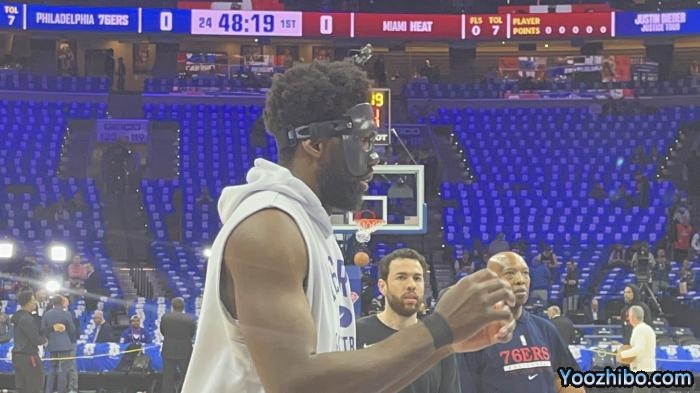 今日恩比德身穿白色帽衫抵达球馆,从照片中看他的眼眶还是有肿胀的情况;之后恩比德戴着特制的面具走进球场,并且戴着面具进行热身,现场球迷集体为他欢呼、呐喊;恩比德曾在2018年遭遇眼眶骨折和脑震荡,因此缺席了三周,而如今,恩比德仅歇8天就火线复出。