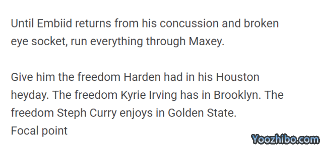 恩比德能否在G3复出还不确定,如果他继续休战,被逼到悬崖边上的76人该怎么办?Marcus Hayes认为答案不在哈登的身上,而在二年级新星马克西的手中。这轮系列赛的前两场比赛,马克西场均26.5分,投篮命中率48.6%,哈登场均18分,投篮命中率39.3%。哈登连续两场比赛的下半场都只得到4分。