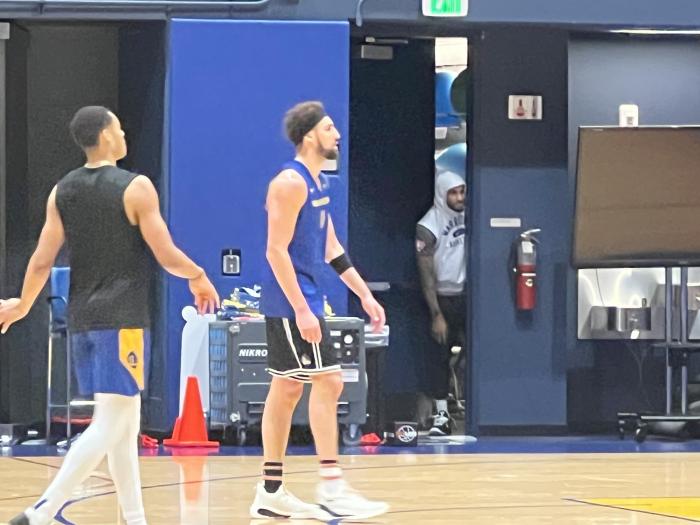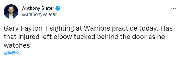 勇士随队记者Anthony Slater晒出了今日勇士例行训练的照片,因伤无法参加的佩顿二世推开训练场大门,在门后观看全队进行训练,该记者配文写道:佩顿在关注全队训练时,还将自己受伤的左肘藏在了门后。
