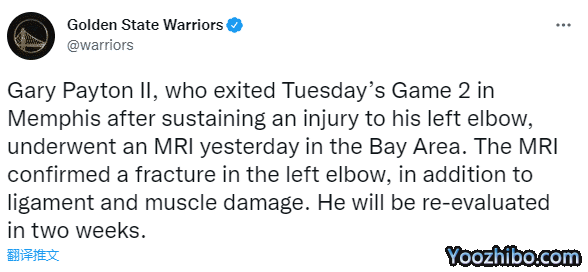 JRS直播05月06日讯 ,勇士官方宣布,小佩顿不仅左手肘骨折,同时出现韧带和肌肉损伤,他将在两周后接受复查,换句话说,小佩顿至少伤停2周,因伤缺席西部半决赛剩余的比赛,而且没有具体复出时间表。