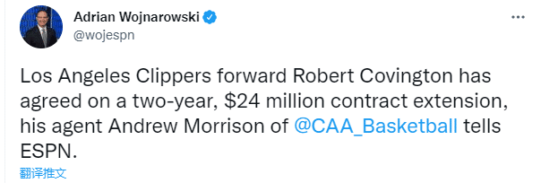 JRS直播05月06日讯 ,快船悍将确定回归,据ESPN名记沃纳罗斯基报道,球员经纪人透露,考文顿已经与快船达成了一份2年价值2400万美元的续约合同。