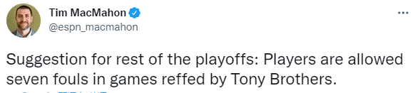 对于裁判的吹罚,名记Tim MacMahon发表了自己的看法,他更推写道:建议在剩余的季后赛中,在托尼兄弟吹罚的比赛里,球员们可以七犯离场。