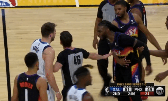JRS直播05月05日讯 ,NBA季后赛独行侠G2再战太阳,上半场裁判吹罚引争议,两队半场累计30次犯规,多达6名球员半场吃到3次犯规;太阳一度33秒连续吃到3次进攻犯规,克劳德怒喷东契奇吃到技犯,名记直呼每名球员都该7犯离场。