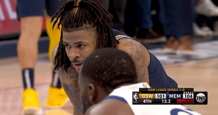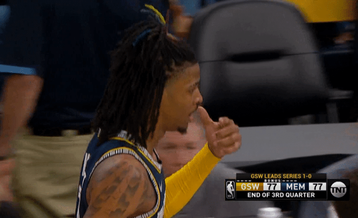 莫兰特第三节贡献6分,等到了末节,莫兰特再次开启得分模式,多次杀到禁区得分,单节独砍18分接管进攻,最后4分钟包揽灰熊全部15分,用硬气的表现顶住压力,最终带队拿下G2,扳平系列赛大比分;莫兰特一度在第三节结束时返回更衣室,眼睛看不清。