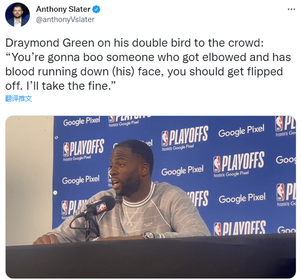 赛后谈到被肘击后离场时冲球迷竖中指,格林表示:我被肘击然后血流了一脸,还要被球迷嘘,那我就要怼回去。我感觉很棒,他们也欢呼了,我估计我会因此交罚款,不过我今年赚2500万美金,这没关系。