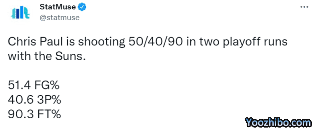 提及保罗的动态,StatMuse写道:“这两个赛季带领太阳出战季后赛,保罗的投篮命中率51.4%,三分命中率40.6%,罚球命中率90.3%。”换言之,保罗在效力太阳的季后赛之旅目前是180俱乐部(投篮命中率至少50%,三分命中率至少40%,罚球命中率至少90%)的投射水准。