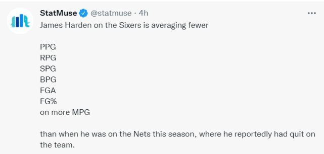 再看看看哈登的动态,StatMuse写道:“和本赛季效力篮网(那支被哈登抛弃的球队)时期相比,哈登在76人出场时间更多的前提下,场均得分、场均篮板、场均抢断、场均盖帽、场均出手数和命中率全部下降。”