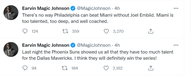 目前,太阳1-0领先独行侠,76人0-1落后热火。名宿“魔术师”约翰逊对两队的前景也有所分析。谈及哈登的76人,魔术师写道:“没有恩比德,费城不可能击败迈阿密。热火太有天赋,阵容深度太棒了,而且训练有素。”而谈及保罗的太阳,魔术师写道:“昨晚菲尼克斯太阳向我们展示了他们比独行侠更有天赋,我认为他们肯定能赢得这轮系列赛!”