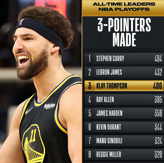 除了维金斯之外,这场比赛勇士核心之一的克莱也迎来里程碑时刻,他在比赛中命中三分球,这样克莱成为NBA历史第三位在季后赛投进400记三分的球员,仅次于库里和詹姆斯,他的发挥对于勇士来说也是很关键的。