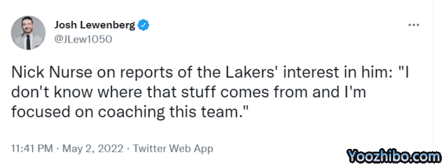 JRS直播05月03日讯 名记查拉尼亚曾报道,猛龙主帅尼克-纳斯是湖人选帅的头号目标。北京时间5月3日,纳斯在采访中正式回应了这一流言,他说道:“我不知道那些流言是从哪传出来的,我专注于执教现在的这支队伍。”换言之,纳斯的心思在猛龙身上,没有意愿离开多伦多。