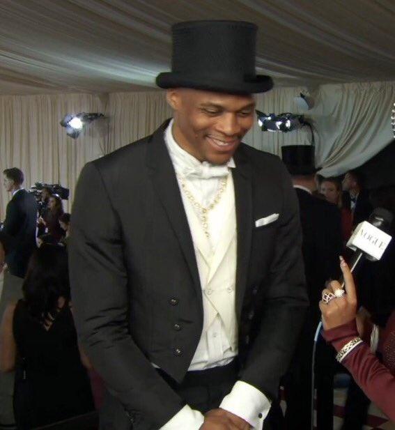 威少身穿黑色礼服和礼帽、穿着一条黑色百褶苏格兰裙和黑色皮鞋,亮相Met Gala走红毯;威少如此潮流的造型遭吐槽,有球迷表示我现在明白为什么杜兰特离开他了;还有球迷表示联盟中没有人愿意和他当队友,更有球迷晒照恶搞威少防住了詹姆斯。