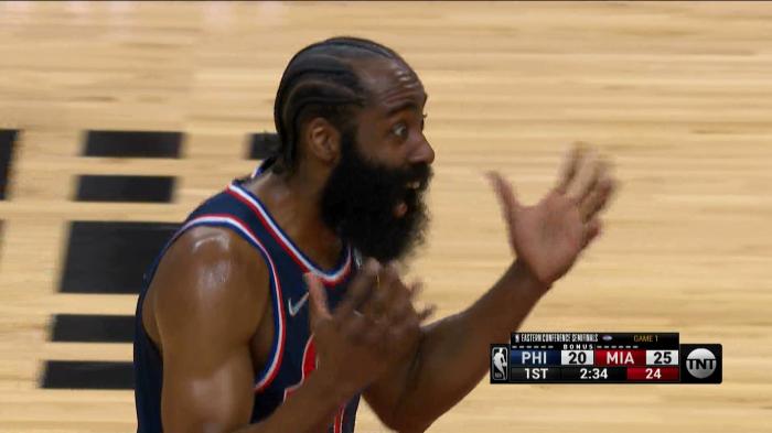 首节比赛,76人开场进攻糟糕,4分多钟被热火打出18-6攻势,瞬间落后到12分;格林三分止血,热火压制76人,期间哈登被PJ-塔克防得难以出手,更是被造进攻犯规;3分47秒,哈登造犯规两罚全中,随后投进后撤步三分,带队9-0反扑追到3分,76人再次哑火被打5-0,首节落后8分。