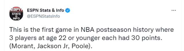 本场比赛,年轻人在绝大部分时间里表现惊艳。莫兰特34分9篮板10助攻,小杰克逊33分10篮板,替补出场的普尔轰下31分8篮板9助攻,刷爆了纪录。这是NBA季后赛历史上第一次同时有3位22岁或以下的球员同场砍下30+的分数。