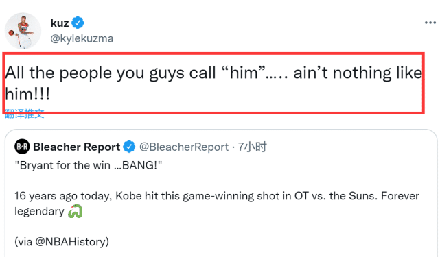 JRS直播05月02日讯 16年前的今天,也就是2006年5月1日,湖人与太阳的季后赛首轮G4,科比常规时间最后时刻上篮实现绝平,紧接着在加时赛用一记压哨跳投绝杀对手。奇才球星库兹马今天在社媒上转发了科比双绝杀视频,并写道:那些所谓的“科比接班人”一点也不像。
