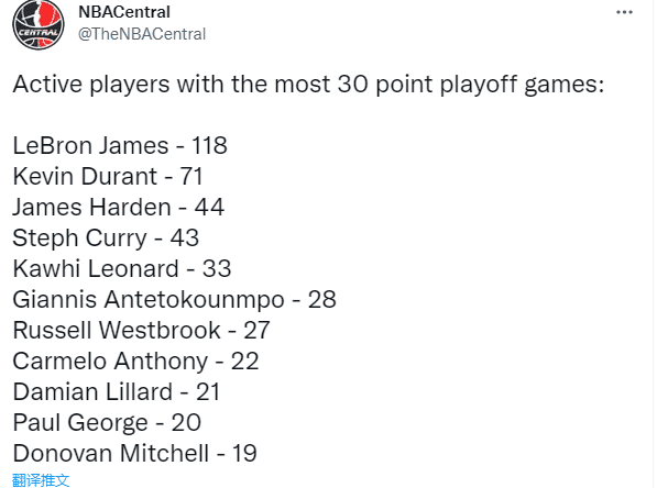 美媒NBACentral晒现役球员季后赛30+次数榜单,前十具体排名如下:
