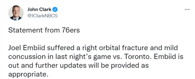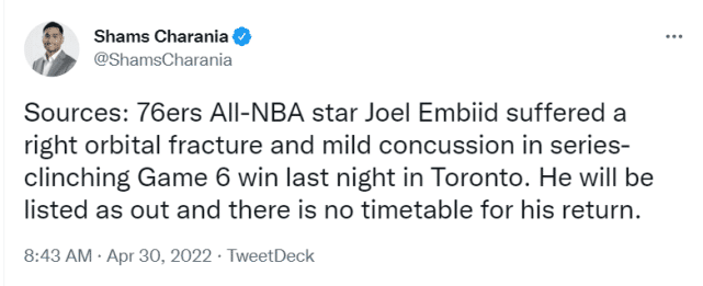 JRS直播04月30日讯 ,76人官方宣布,全明星恩比德在昨天对猛龙的G6一战中右眼眶骨折和轻微脑震荡,他目前被列为“缺阵”的状态,名记查拉尼亚表示他暂无复出时间表。
