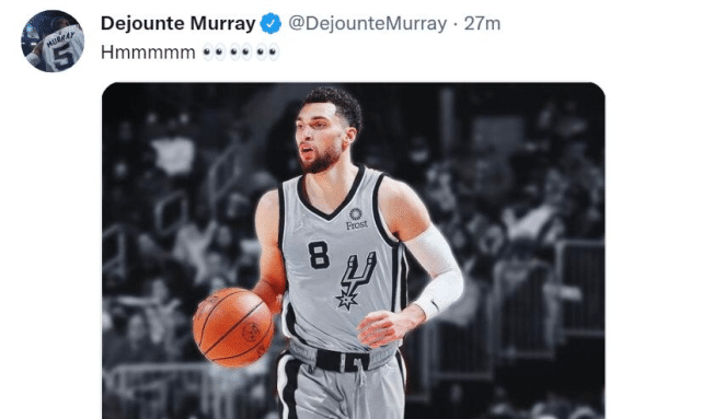 JRS直播04月29日讯 ,马刺球星德章泰-穆雷晒出了一张拉文身穿马刺球衣的PS图,并配上了一连串表情符号。在这个时候晒出这样的图片,意思很明白,穆雷希望看到拉文能披上马刺球衣!