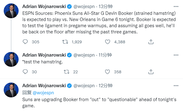 JRS直播04月29日讯 ,据名记沃纳罗斯基报道,消息人士透露,如布克在今日G6对阵鹈鹕的赛前热身中没有遇到挫折,他预计将在该场比赛中迎来复出,布克将通过热身训练来测试自己的韧带,他的出战状态已经从缺席升级为出战成疑,之后太阳主帅蒙蒂已经确定布克今天复出。