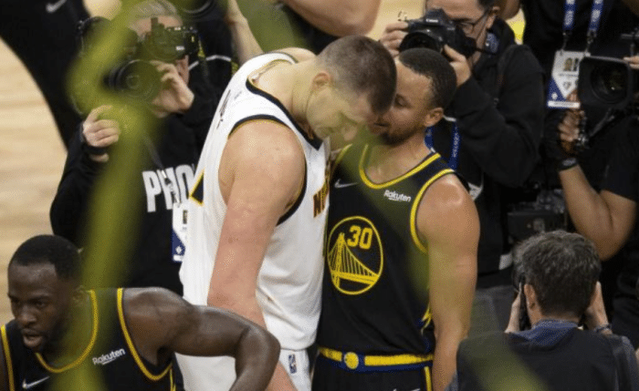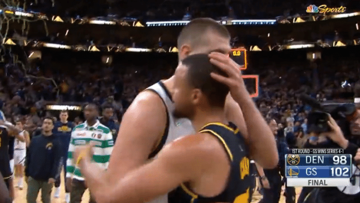 JRS直播04月28日讯,勇士主场拿下系列赛第五场,总比分4-1淘汰掘金从而杀进西部半决赛;库里全场轰下30分5篮板5助攻,下半场独砍20分以及末节关键时刻接管比赛;约基奇狂砍30分19篮板8助攻拼尽全力仍遗憾出局,赛后约基奇拥抱勇士众球星,满脸笑容表达敬意。