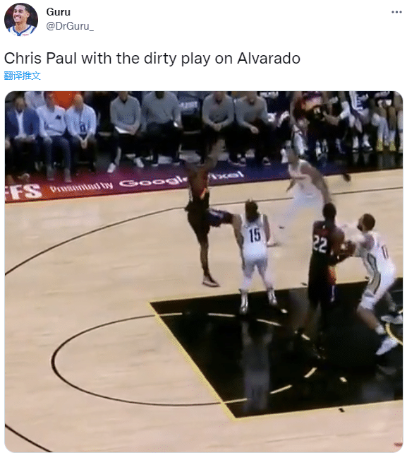 在上半场的一次进攻中,保罗急停跳投,投篮时伸腿踢到阿尔瓦拉多的裆部附近,老六捂着裆部十分痛苦,之后赶紧参与反攻;保罗踢人这一幕引热议,推特账号为Guru的球迷转发这一幕,并且发推写道:保罗替老六的动作太肮脏。