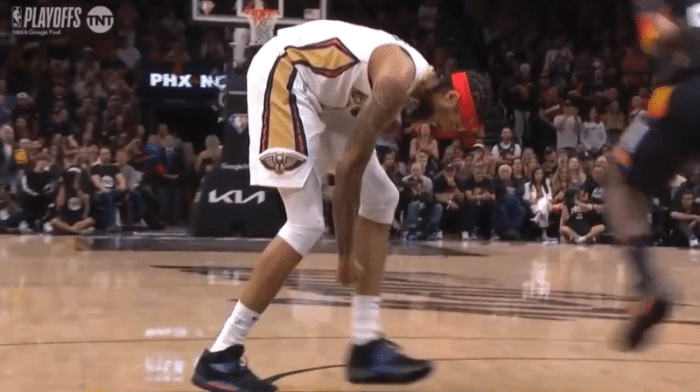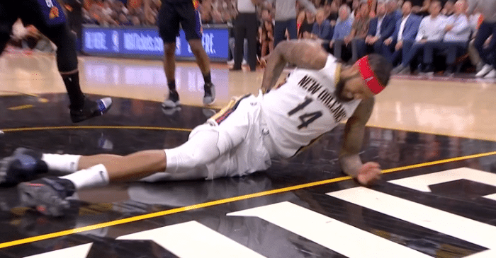 JRS直播04月19日讯 ,NBA季后赛鹈鹕97-112不敌太阳,输掉天王山之后大比分2-3落后,末节英格拉姆两次遭遇惊魂时刻,空中重摔倒地,捂着腰部表情痛苦;疑似手部受伤同样忍痛坚持,下场后沮丧地怒摔矿泉水瓶;英格拉姆尽力了。