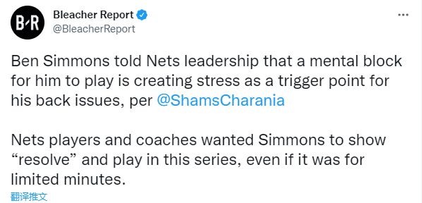 自从被交易到篮网之后,西蒙斯多次接近复出,甚至确定复出的时间,比如计划3月10日复出对战步行者,计划首轮G4复出,可最终他都因背伤问题而推迟复出时间,最终缺席了整个赛季;西蒙斯背伤的根源来自于他的心理障碍,换句话说,上场比赛给了他太大的压力。