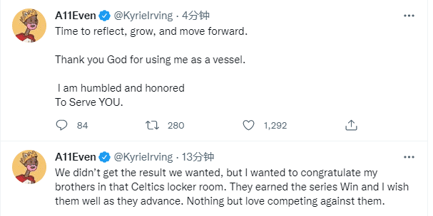 欧文发推写道:我们没有得到我们想要的结果,但我想在凯尔特人更衣室里祝贺我的兄弟们。他们赢得了系列赛的胜利,我祝他们进步顺利。除了喜欢与他们竞争之外,仅此而已。