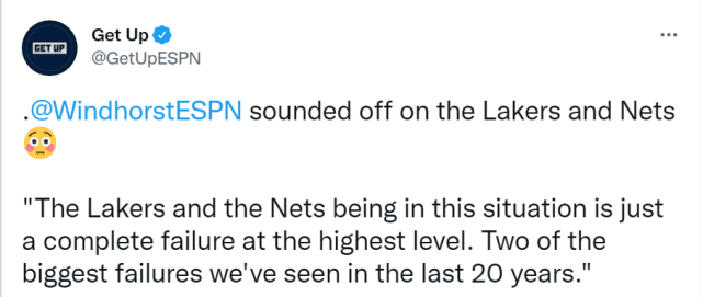 名记文霍斯特在节目上说道:“湖人和篮网处于这样的状况,是最高水平的彻底失败,是我们在过去20年来见证的最大的两次失败。”湖人引进了多位昔日的全明星,打造豪华阵容,篮网的三巨头更是被寄予厚望,他们的失败,确实是最高水平的失败。