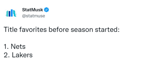 美媒StatMusk写道:“在赛季开始前,夺冠赔率排名前两位的球队是篮网和湖人。”确实如此,当时篮网和湖人是两大夺冠热门,在赛季开打前,篮网夺冠赔率+250,高居第一,湖人+400,排名第二。不少球迷还畅想两队在总决赛碰面,上演詹杜对决!