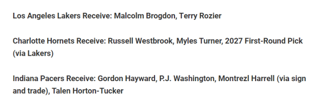 如果达成这样一笔交易,湖人、黄蜂、步行者将组建新的首发阵容,并有望实现各自的目标。