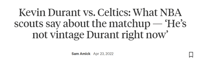 这位西部球探认为绿军的防守策略奏效了。“我数了数,大概有6名球员防过杜兰特,他们是布朗、塔图姆、斯马特、格兰特-威廉姆斯、泰斯和霍福德,”这位球探说,“他们给了杜兰特不同的防守体验,当KD适应一个人的防守,开始找对方漏洞时,绿军又换了另一个人来防他。KD可能在两三分钟内面对两三种不同的防守类型,这一切都会影响他的节奏。我认为KD失常最重要的一点是他在这轮系列赛从来没有进入自己的节奏中。”