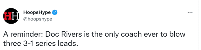 JRS直播04月24日讯 76人客场102-110不敌猛龙,总比分变成3-1!美媒纷纷刷屏调侃76人主帅里弗斯,好熟悉的3-1啊,欢迎猛龙来到里弗斯的国度!美媒HoopsHype更是很损的第一时间更新社媒:“提醒一下,里弗斯是唯一一个三次3-1领先被翻盘的主教练!”如今,又一个3-1来到面前,里弗斯慌了吗?