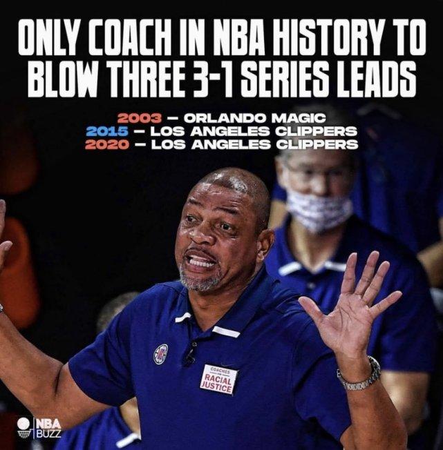 2020年,里弗斯再次遭遇梦魇,西部半决赛面对掘金,类似的剧情又来了一遍。快船3-1领先后,又连输3场,最终无奈出局。这次被翻盘,也让里弗斯和快船结束了合作,最终成为76人的主帅。
