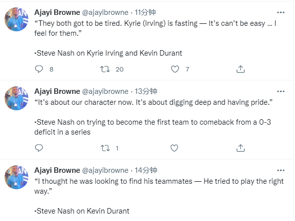 对于篮网双巨的表现,纳什表示:杜兰特和欧文肯定都已经很累了,欧文正在禁食,杜兰特在因伤缺席6-7周后又连着5、6个礼拜每场都打40多分钟,所以这真的很不容易,我能体会他们的感受。