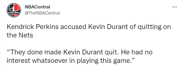 帕金斯指责杜兰特已经放弃了篮网,表示:他们确实让杜兰特放弃了,他对这个比赛一点兴趣都没有;帕金斯还直言杜兰特和篮网已经被淘汰了。