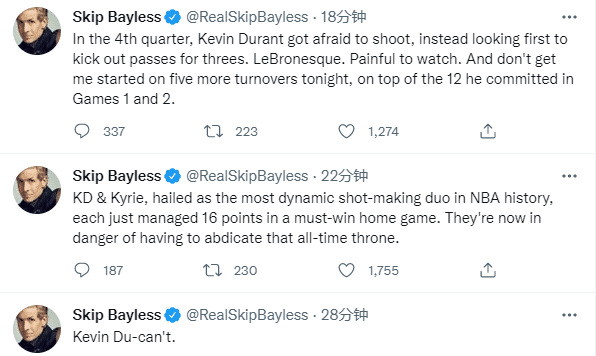 Skip狂喷杜兰特,发推写道:在第四节,杜兰特不敢投篮,而是传球找队友,勒布朗式的表现。看起来让人感到痛苦。在前两场失误12次,今天再次有5个失误,KD和欧文恐怕要失去历史上最具技巧双人组的头衔了。