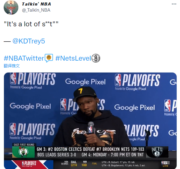 杜兰特还爆粗口,直言这是一场狗屎一样的比赛,之后KD结束采访。