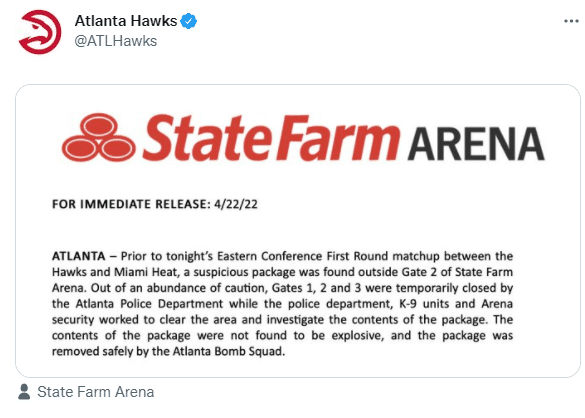 针对球馆外可疑包裹事件,老鹰官方声明:在今晚老鹰对阵热火的东部首轮系列赛比赛开始之前,州立农业球馆的2号大门外有一个可疑包裹被发现。出于谨慎考虑,球馆的1、2、3号大门被亚特兰大警方临时关闭。同时,警察局、警犬分队以及球馆安保人员共同确保清理事发区域并调查包裹成分。包裹内的成分被认为不具有爆炸物,该包裹也被亚特兰大爆炸物处置小队安全移除。