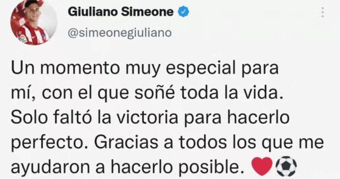 赛后小西蒙尼在社交媒体上表示:“对我来说,这是一个非常特别的时刻,是我一生的梦想。唯一缺少的是一场胜利,感谢所有帮助我实现这一梦想的人。”