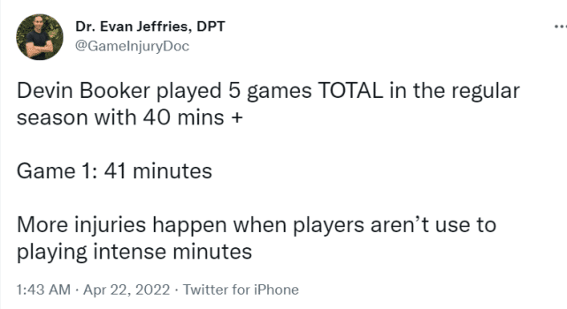 医学专家Evan Jeffries表示,布克的受伤,或许和上场时间有关。“布克在常规赛期间一共只有5场比赛上场时间超过40分钟,而G1的比赛他打了41分钟。当球员不适应更多出场时间的时候,更多的伤病会发生。”