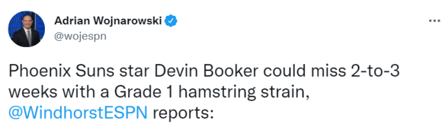 此前,ESPN名记沃纳罗斯基已经报道称,布克很可能缺席G3和G4的比赛,太阳方面仍在评估他和核磁检查结果,并没有给出一个明确的回归时间表。