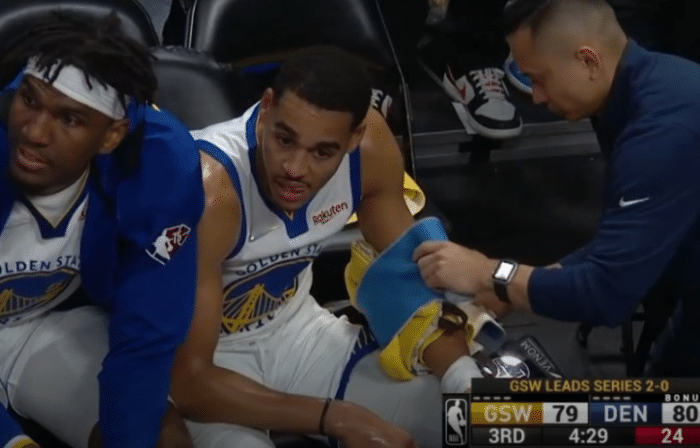 第四节,双方继续胶着比分,普尔2+1打成,掘金则连续造犯规罚球。波特突破得分,戈登命中三分回应。汤神三分再中,约基奇三分回应。伊戈达拉暴力隔扣2+1!约基奇抛投再中。双方此后连续罚球,比分来到109平。约基奇突破得分反超,维金斯三分命中,勇士112-111领先。关键时刻又是维金斯,抢下前场板,普尔突破命中。掘金连续不中,库里突破得分,勇士116-111领先。最后阶段,格林关键抢断,比赛失去悬念,最终勇士取胜。约基奇绝望离场,他的球队陷入0-3绝境,这是76年无解魔咒!