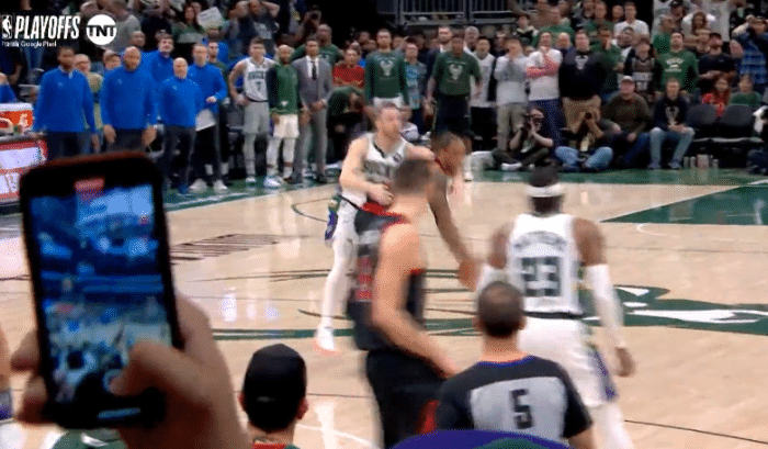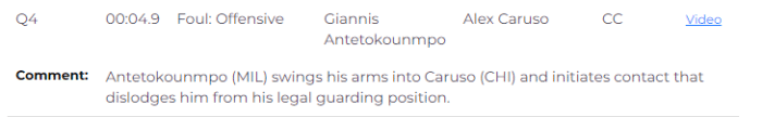 终场前4.9秒,字母哥撞倒卡鲁索从而被吹进攻犯规,致命失误葬送逆转的希望,裁判报告显示,字母哥伸开双臂撞倒了站在合法位置上的卡鲁索,这是一次正确吹罚。