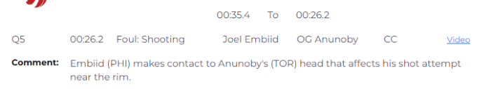 加时赛26.2秒,阿奴诺比突破上篮时被恩比德犯规,后者十分不满裁判的吹罚,裁判报告显示,恩比德打到阿奴诺比的头部,应该吹罚恩比德防守犯规。